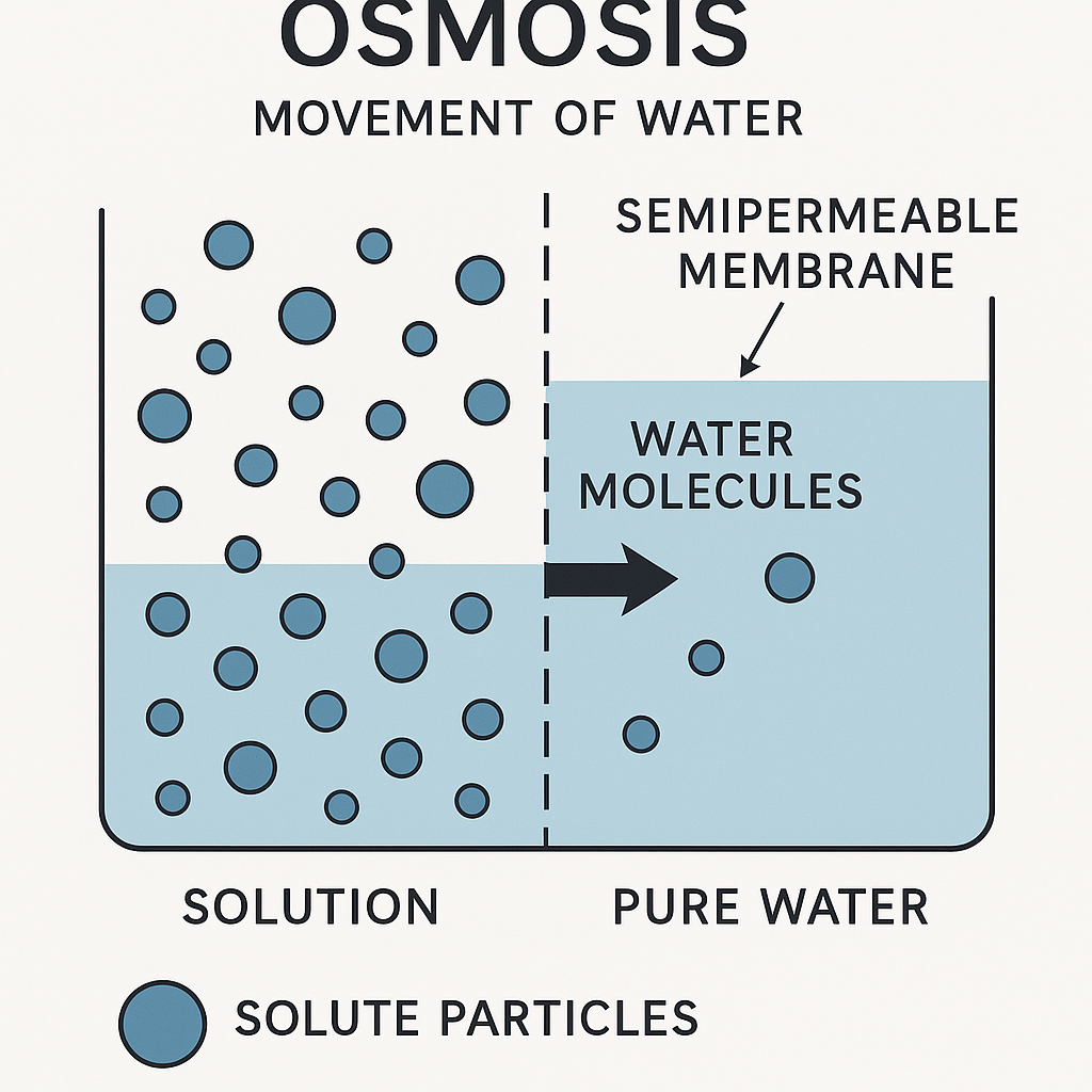 반투과성 막은 삼투 현상이 발생하기 위한 필수 조건이다. 이 막은 물과 같은 작은 용매 분자는 통과시키지만, 이온이나 큰 분자와 같은 용질은 통과시키지 못한다. 이러한 선택적 투과성 때문에 막 양쪽 용액의 농도 차이가 그대로 유지되며, 그 결과 용매 이동이 발생한다. 삼투압(π)은 이 용매 이동을 막기 위해 외부에서 가해야 하는 압력으로 정의되며, 다음과 같은 반트호프 식으로 표현된다. π = iMRT 여기서 i는 반트호프 계수, M은 몰농도, R은 기체상수, T는 절대온도다. 이 식은 삼투압이 입자 수에 비례하는 총괄성질임을 명확히 보여준다. 삼투 현상은 용액의 상대적 농도에 따라 다음과 같이 구분된다. - **저장성 용액**: 세포 외부 농도가 낮아 물이 세포 안으로 이동 → 세포 팽창 - **고장성 용액**: 세포 외부 농도가 높아 물이 세포 밖으로 이동 → 세포 수축 - **등장성 용액**: 농도가 같아 순수한 물 이동 없음 → 세포 안정 이 개념은 의학에서 수액 조성 결정, 생물학에서 세포 배양, 식물학에서 뿌리 수분 흡수 설명 등에 직접적으로 적용된다.
