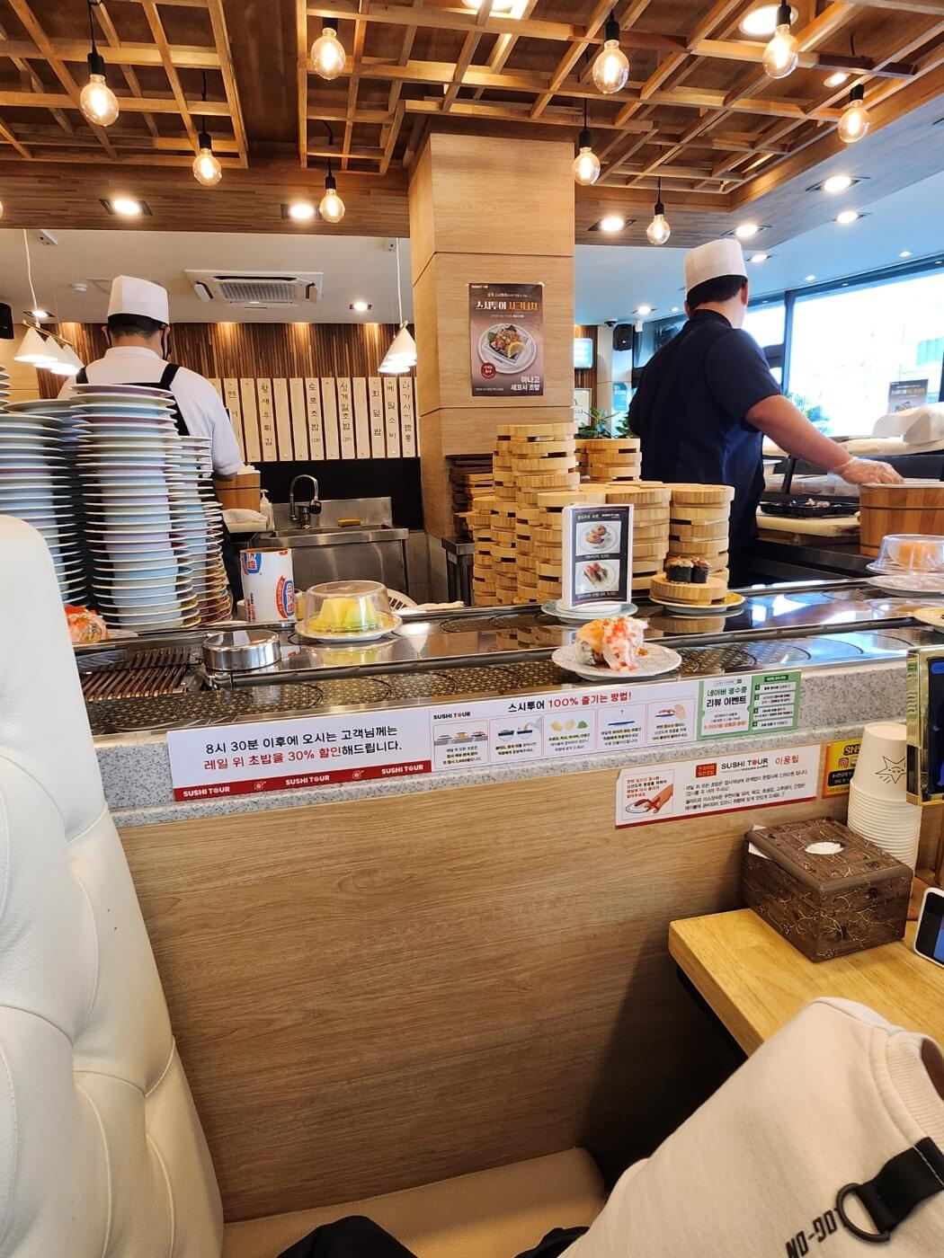 초밥이 돌아가는 레일 위는 정갈하게 정리되어 있으며, 직원들이 주기적으로 위생을 점검하는 모습을 볼 수 있었습니다.